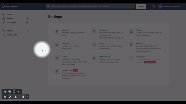 On your Return Prime dashboard, navigate to Settings > Reasons