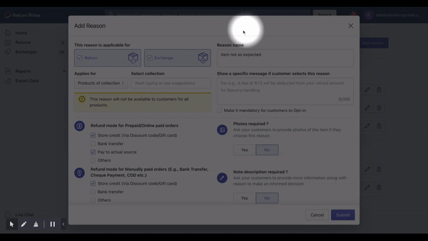 Lot of times, you may need to create return/exchange reason specific to a product or collection. You can create and restrict reasons using the below 4 conditions: