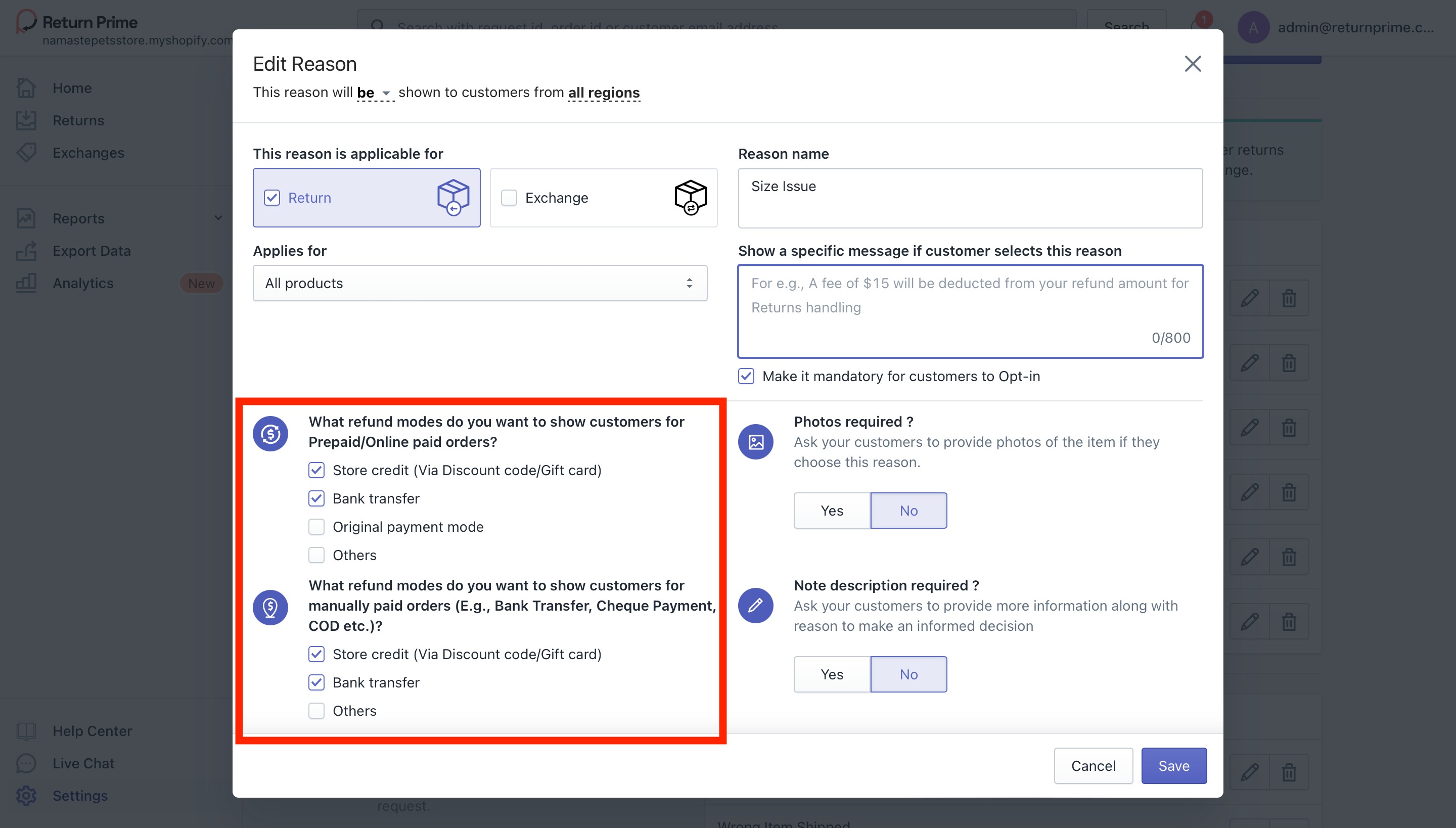 Multiple refund modes are available on Return Prime to help merchants in processing the amount to the customer according to their type of order. They can configure the refund modes according to a particular reason.