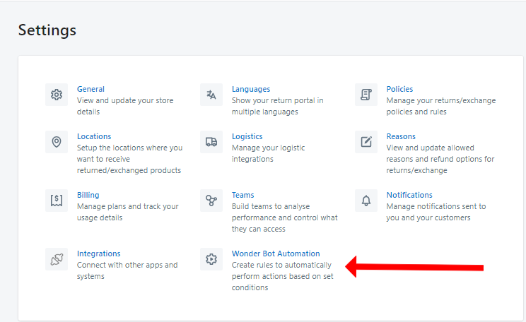 Log in to your Return Prime merchant account and navigate to the Wonder Bot Automation settings. This is where you'll configure the rules that govern the automation of return requests.