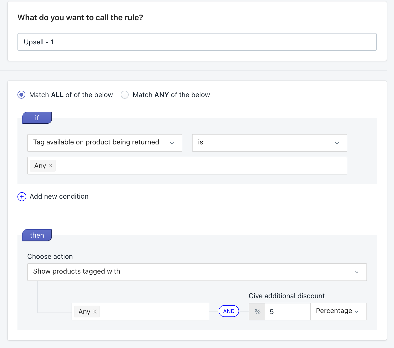 You can create a rule like the below one to show any product in upsell. Here you can also definite if you want to offer any incentive if they purchase any new item.